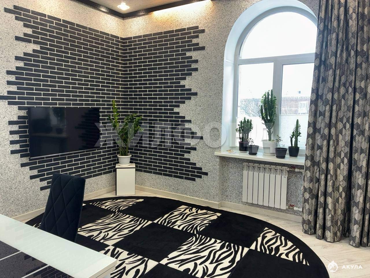 Особое внимание уделено отделке: в гостиной стены украшены элегантными жидкими обоями, создающими неповторимую атмосферу. Коридор выполнен в стилистике Лофт, где сочетание декоративной штукатурки и фактурного кирпича придает интерьеру индустриальный шарм. Санузел облицован стильным кафелем.